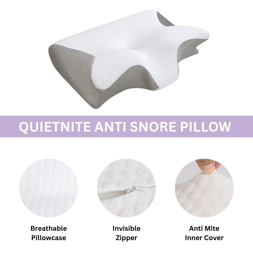 Enjoy restful nights with our signature QuietNite Anti-Snore Pillow, crafted with a plush polyester cover and supportive memory foam filling. To use, simply place it inside your regular pillowcase and position it as you would any standard pillow. Ideal for back or side sleepers, this pillow helps promote better airflow and minimise snoring, so you (and your partner) can wake up feeling refreshed.